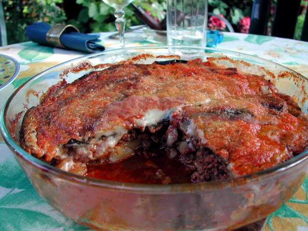 Kartoffeln, 500 g Rinder- oder Lammhackfleisch, Olivenöl, Knoblauch, Oregano, Pfeffer, Salz, 2 gehackte Zwiebeln, 2 gehackte Tomaten, 2-4 Auberginen, Pfeffer und Salz, etwas geriebenen Graviera, Kéfalotyri oder Parmesan, |